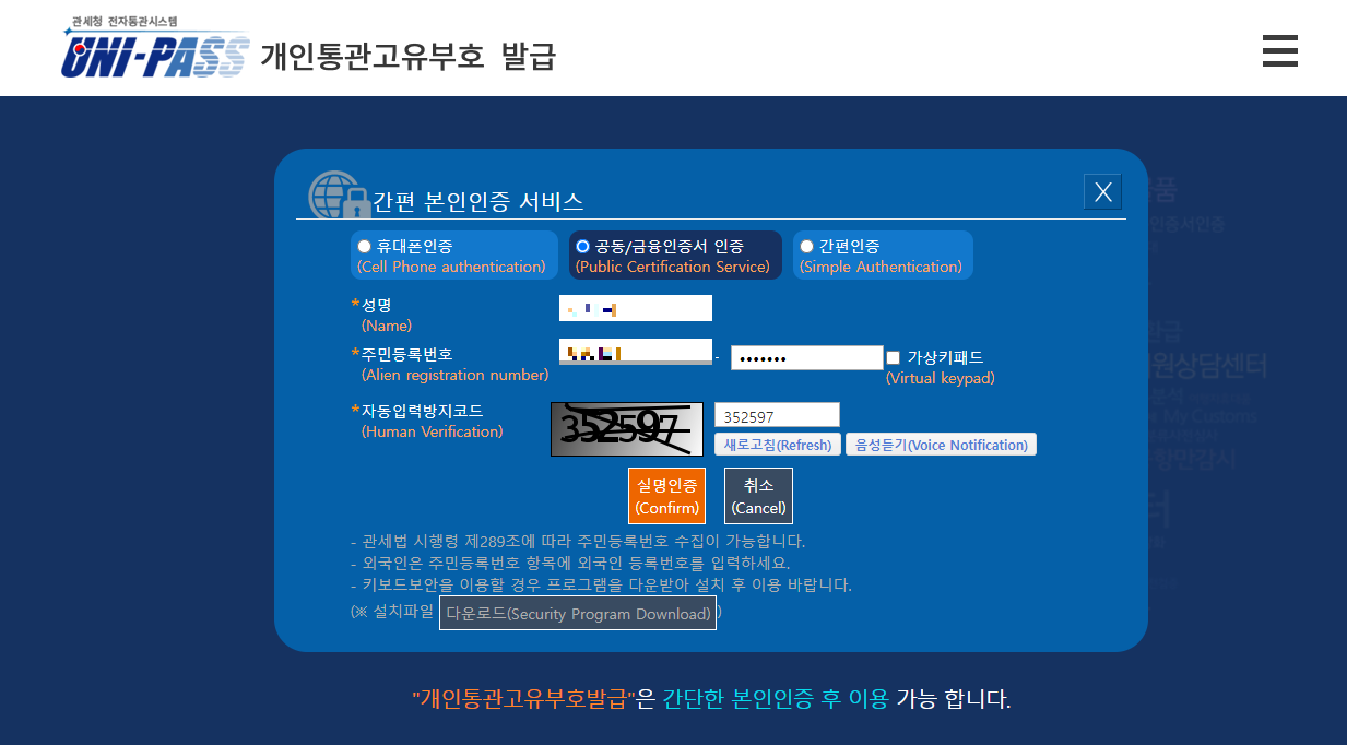 신규로발급받으시는 분들은 신규발급 버튼을 누르시면 아래와 본인인증 후에 간단한 입력페이지에 간단한 개인정보를 입력하시면 발급받을 수 있습니다. 공인인증서가 있으시면 간단히 받으실 수 있고 아니면 휴대폰인증으로도 본인인증을 받으실 수 있습니다.